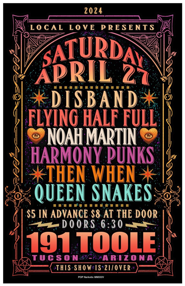 Then When will be hitting the stage on Saturday, April 27 at 191 Toole. Local Love Presents has put together a killer line up of Tucson greats: Queen Snakes, Then When, Harmony Punks, Noah Martin, Flying Half Full, and Disband! It’s been a hot minute since Then When have taken the stage and we’re excited to kick some ass! Come out and party with us and remember why live music makes you feel great!